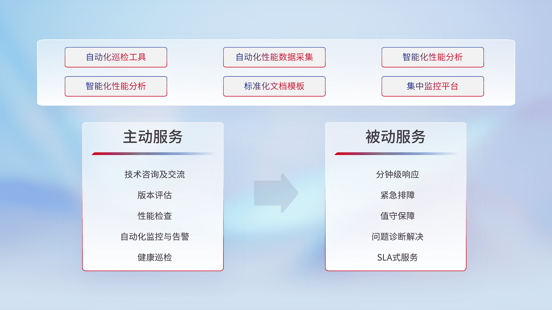 智能化工具和标准化文档,,,,保障服务质量,,,,提供主动服务(包含技术咨询、、、、版本评估、、、、性能检查、、、、自动化监控与告警、、健康巡检)和被动服务包含(分钟级响应、、紧急排障、、、、值守保障、、、、问题诊断解决、、、、SLA服务)。。。。
